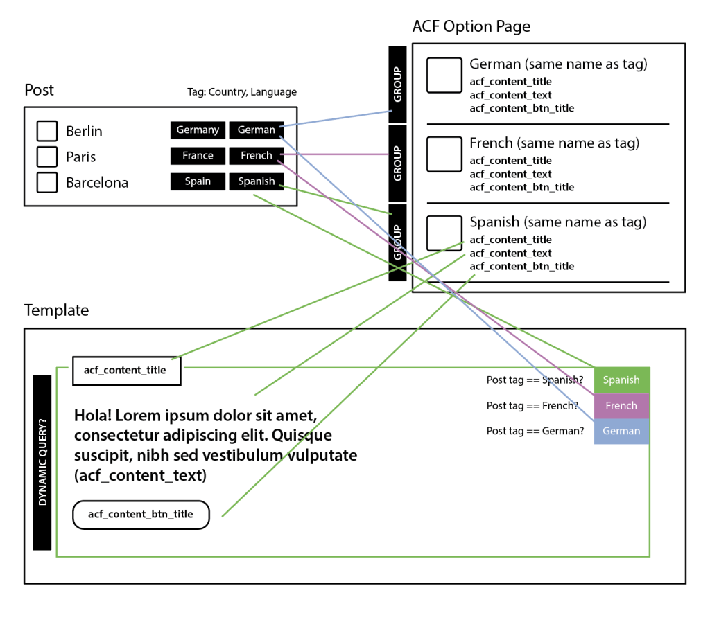 As I said, this is a very simple example. Instead of having all the data in a post, I want to manage this more centralised through a ACF option page where I can edit the data from there and is then dynamically loaded based on a tag. The country tag is used for something else entirely, that's why it's there.