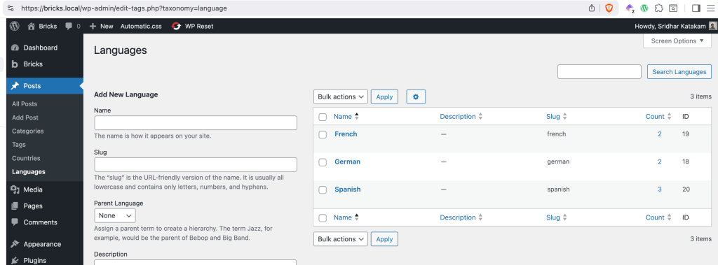 First, there's a Language taxonomy for posts (could be standard posts or a CPT posts) with these sample terms:
