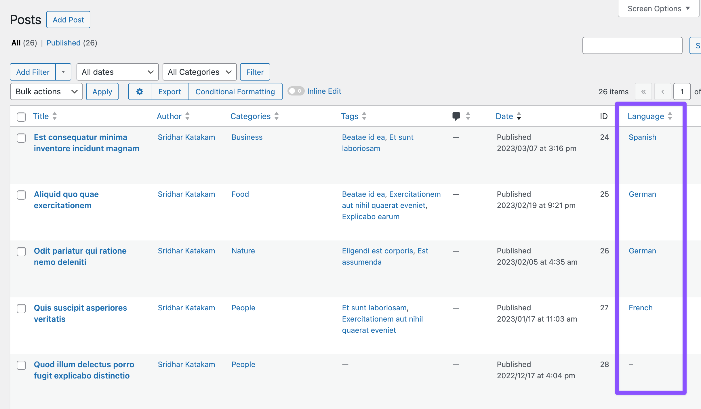 Sample posts with languages assigned: