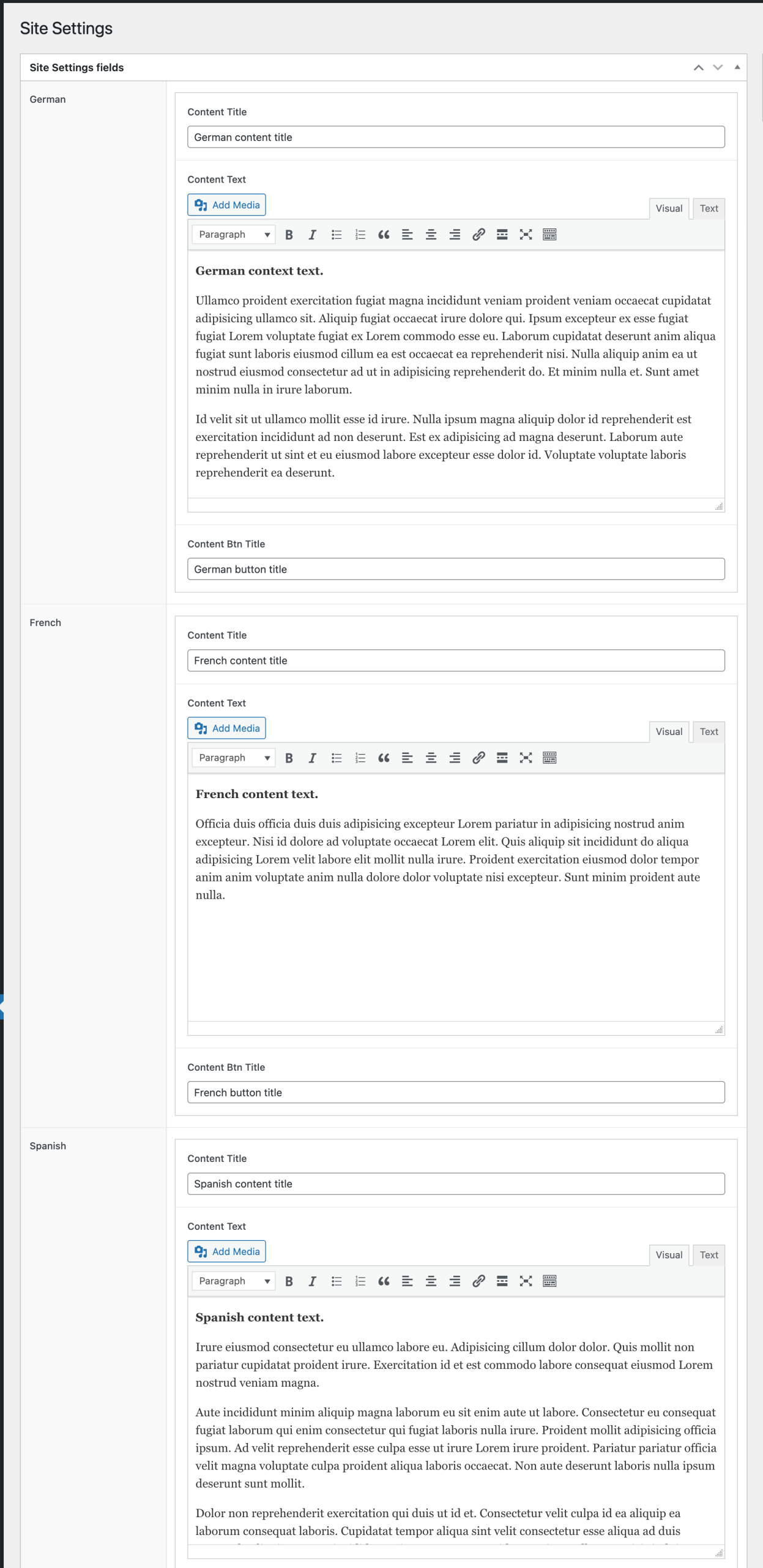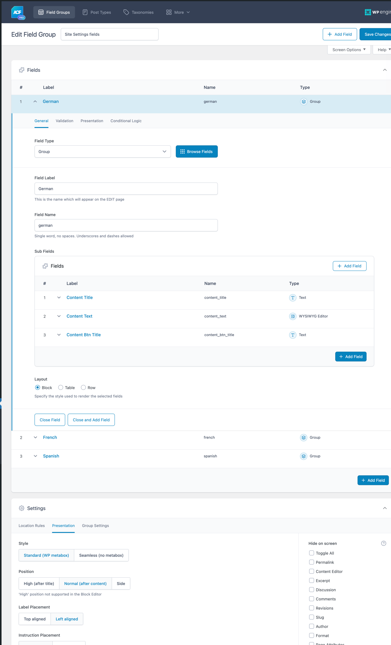 Each language has a Group field of its own and the sub field names are the same inside each.