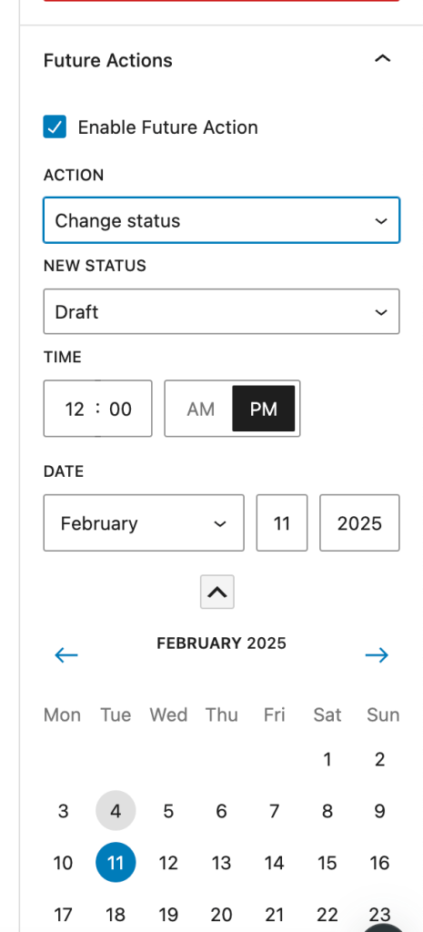 It provides a handy [futureaction] shortcode that outputs the current single post's action date.