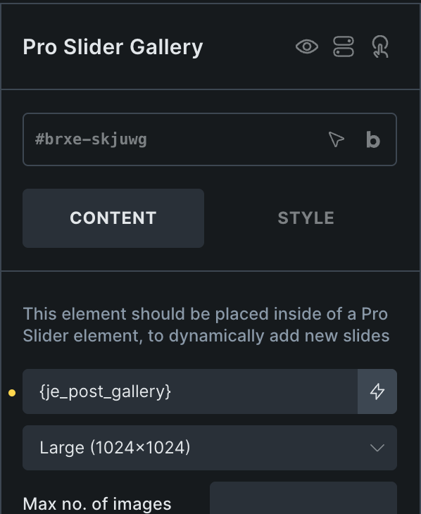For the Pro Slider Gallery element, select your gallery’s custom field.