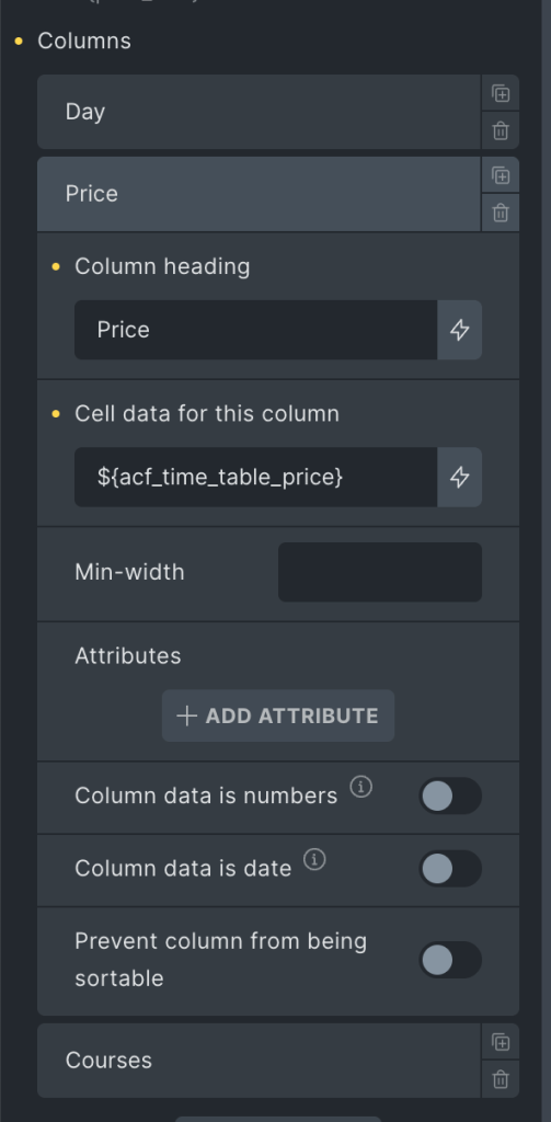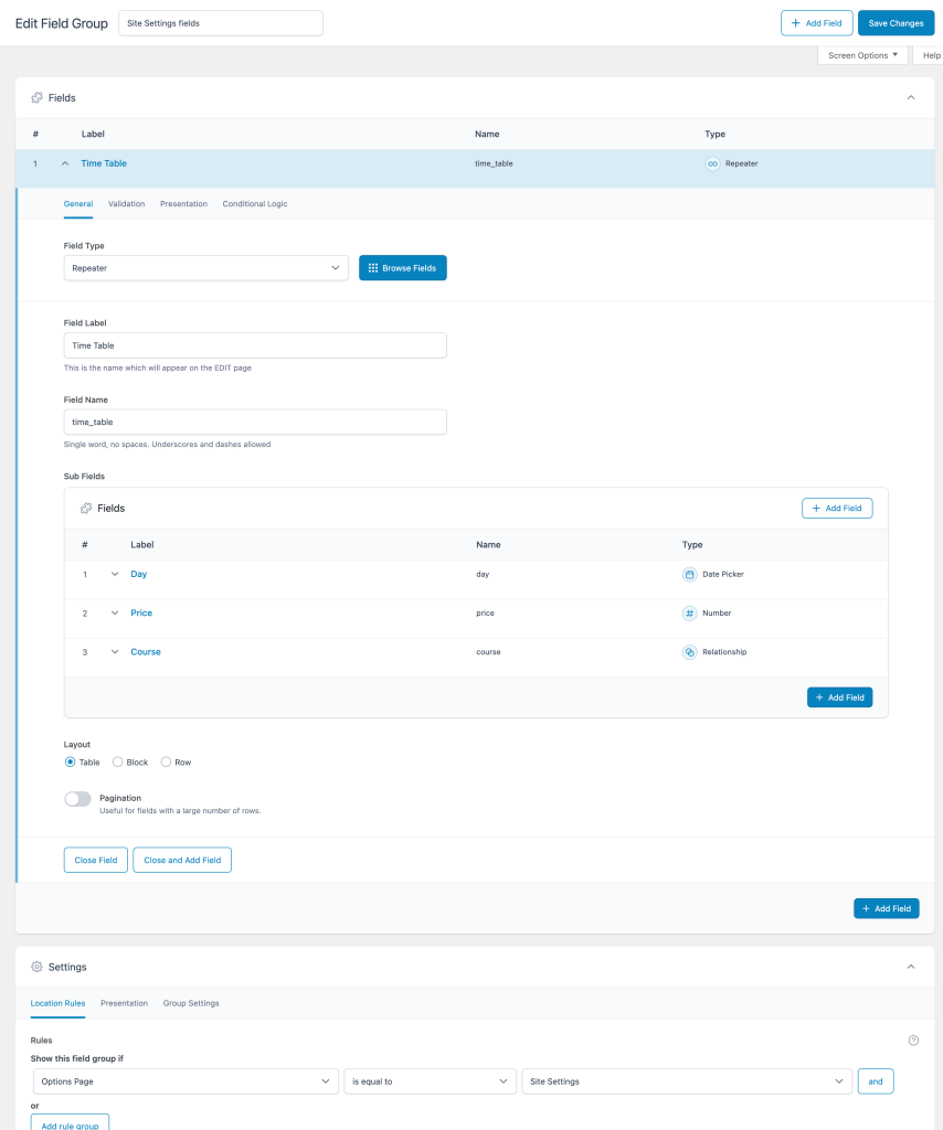2. Global Options with a TimeTable with repeater Field, on this timetable, with some fields like "Day", "Price", and "Course (Relationship field)"