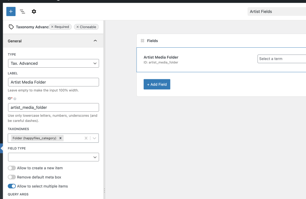I’m building a single-page template for a custom post type that represents different performance artists. Each artist has their own HappyFiles folder for images, and I’m using a MetaBox Taxonomy Advanced field to select the folder on each post. I have made the HappyFiles category taxonomy public so I can query it in Bricks.