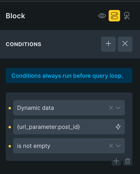 Additionally, you may want to add this dynamic data condition on the query loop-enabled Block to ensure that it gets output only if the URL parameter has a value.