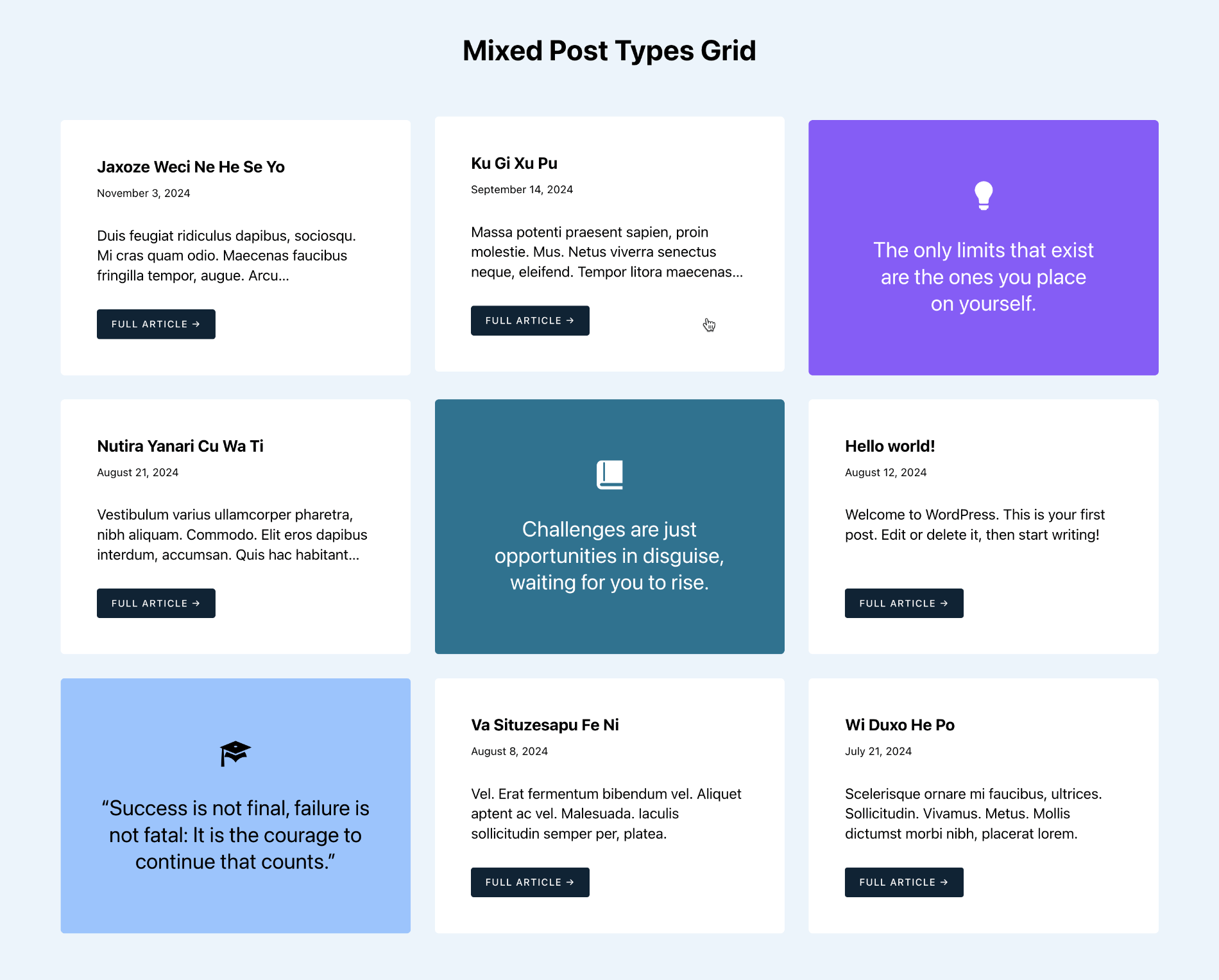 If items of both the post types are to show the same type of data, for example, post title, published date and excerpt we could set up data attribute or a dynamic class on the query loop and add CSS order property to manually arrange the quote posts in each row. This is especially true when the number of items in the grid is fixed - say 9.