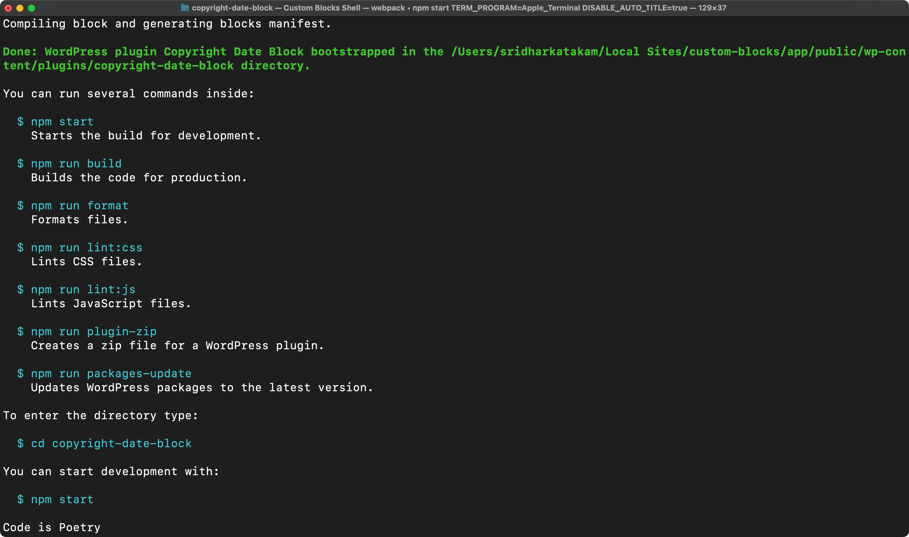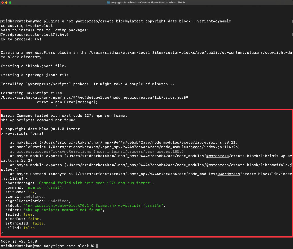 npxcommand creates the plugin folder calledcopyright-date-blockinside thepluginsdirectory.