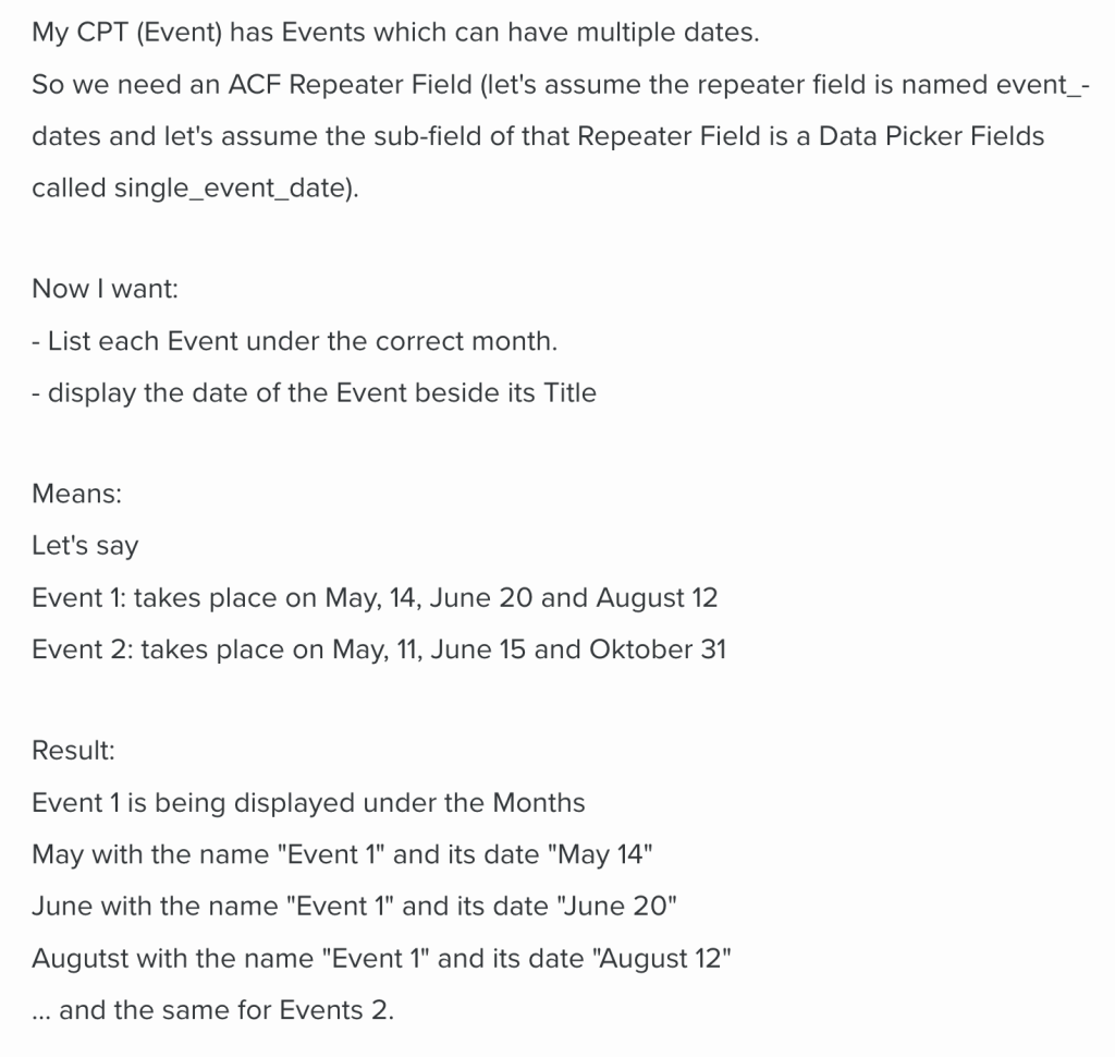 - process each event's dates using ACF repeater fields