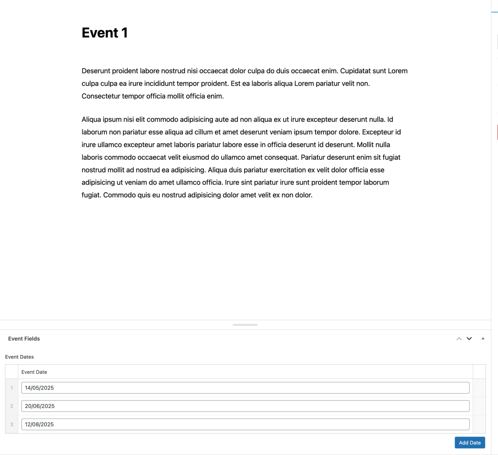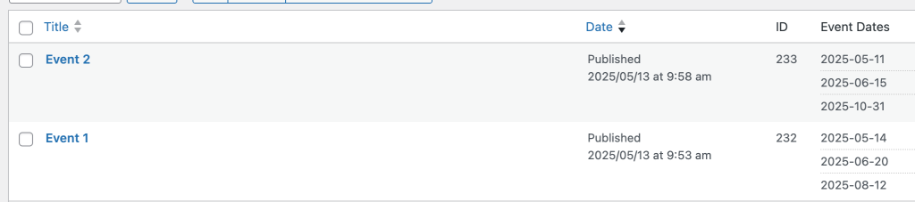 Create event posts and set all the dates on which each event is set to occur.