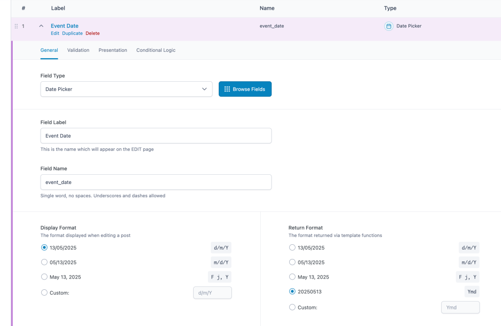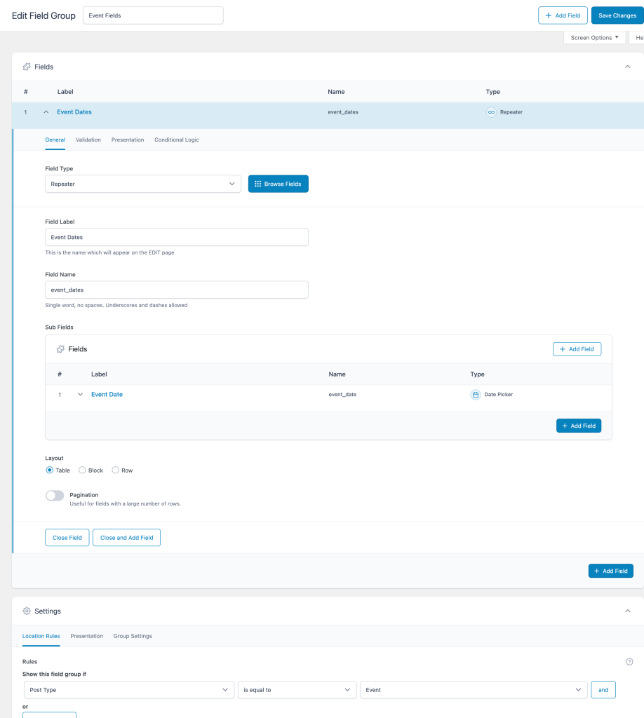 CPT: eventACF Field: event_dates (Repeater) with event_date sub field